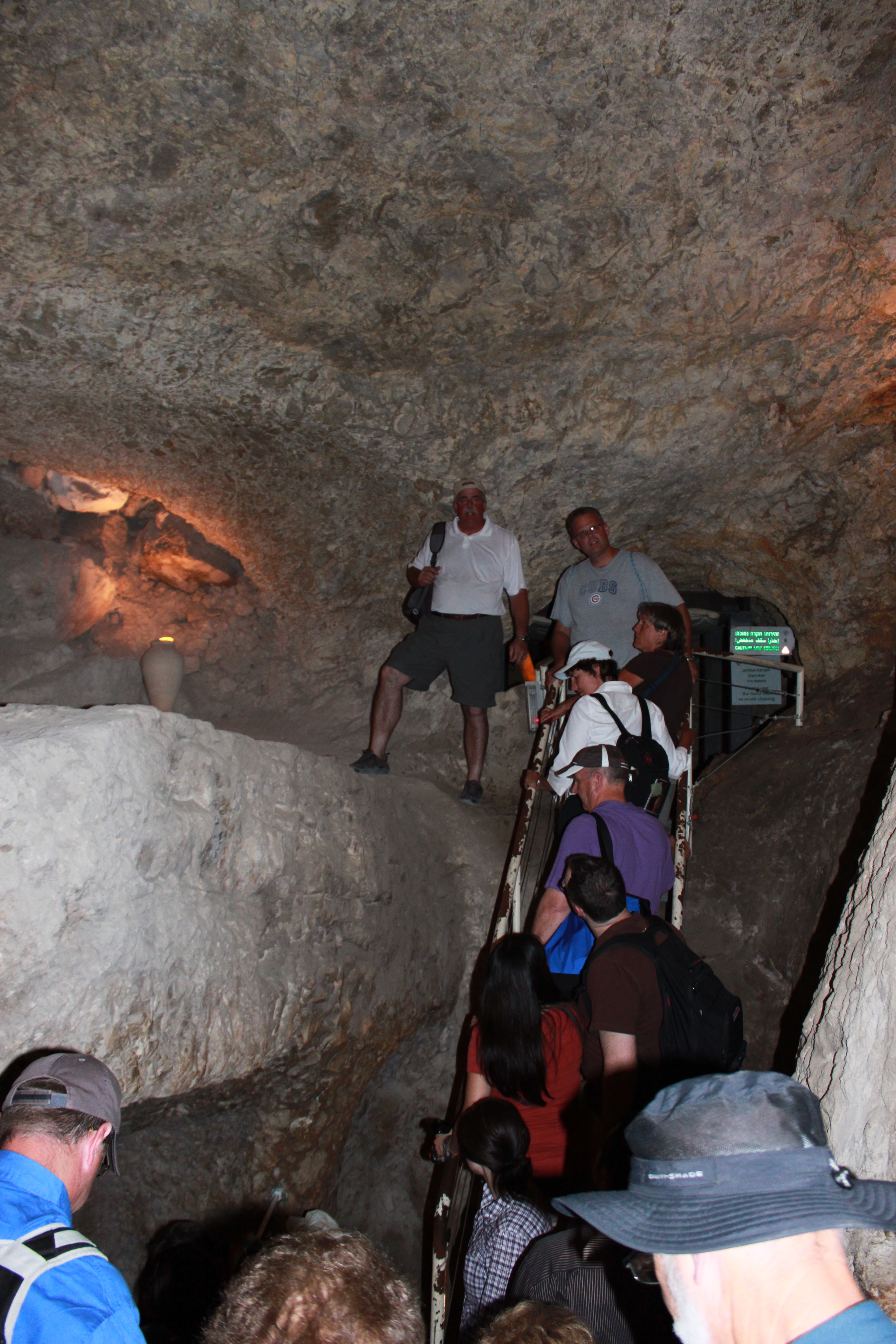 IMG_5617 We walked into many an old church, usually constructed dead atop some Biblically important site, now entirely obliterated by the building meant to commemorate the very event it now obscures. Perhaps the most adventurous activity was wading through the narrow (and sometimes short) tunnel of Hezekiah, a 1750 foot wonder that snakes around back and forth under the old City of David and takes water from the Gihon Spring to the Pool of Siloam.  This required feet that could withstand long exposure to the cold and still flowing spring water, a flashlight, and the ability to duck repeatedly, as well as a decent ability to fight off claustrophobia.  But we all made it through, shamed by the 90 year old lady who soldiered through it with us without a word of complaint or even a slow step.  Climbing the recently unearthed ceremonial staircase from the Pool of Siloam to the Temple Mount above (way above, I might add) turned into another spelunking adventure as we ended up squeezing between ancient ashlars that framed a drainage system (at least that was our best guess).